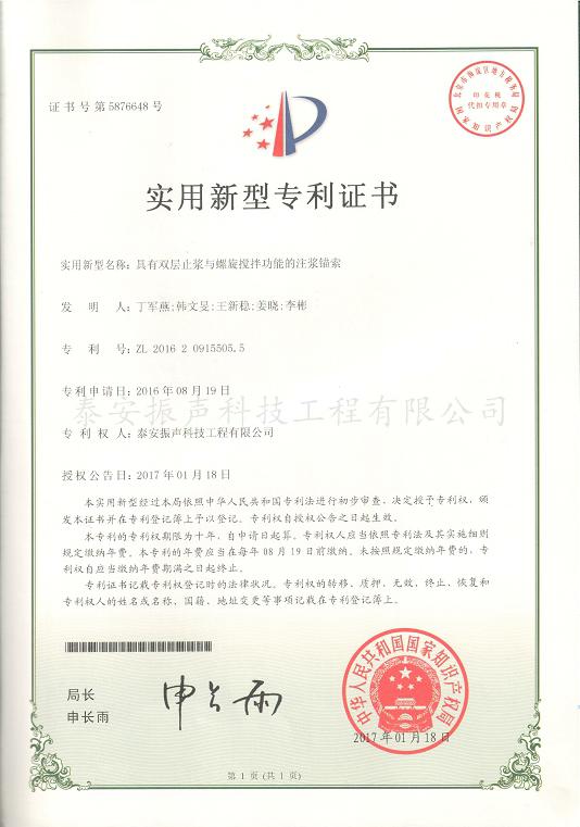 具有雙層止?jié){與螺旋攪拌功能的注漿錨索專利證書